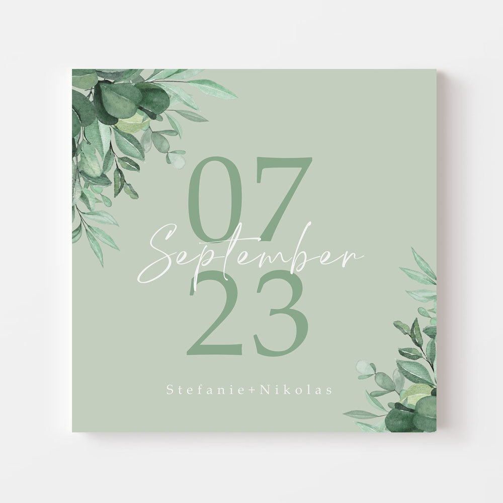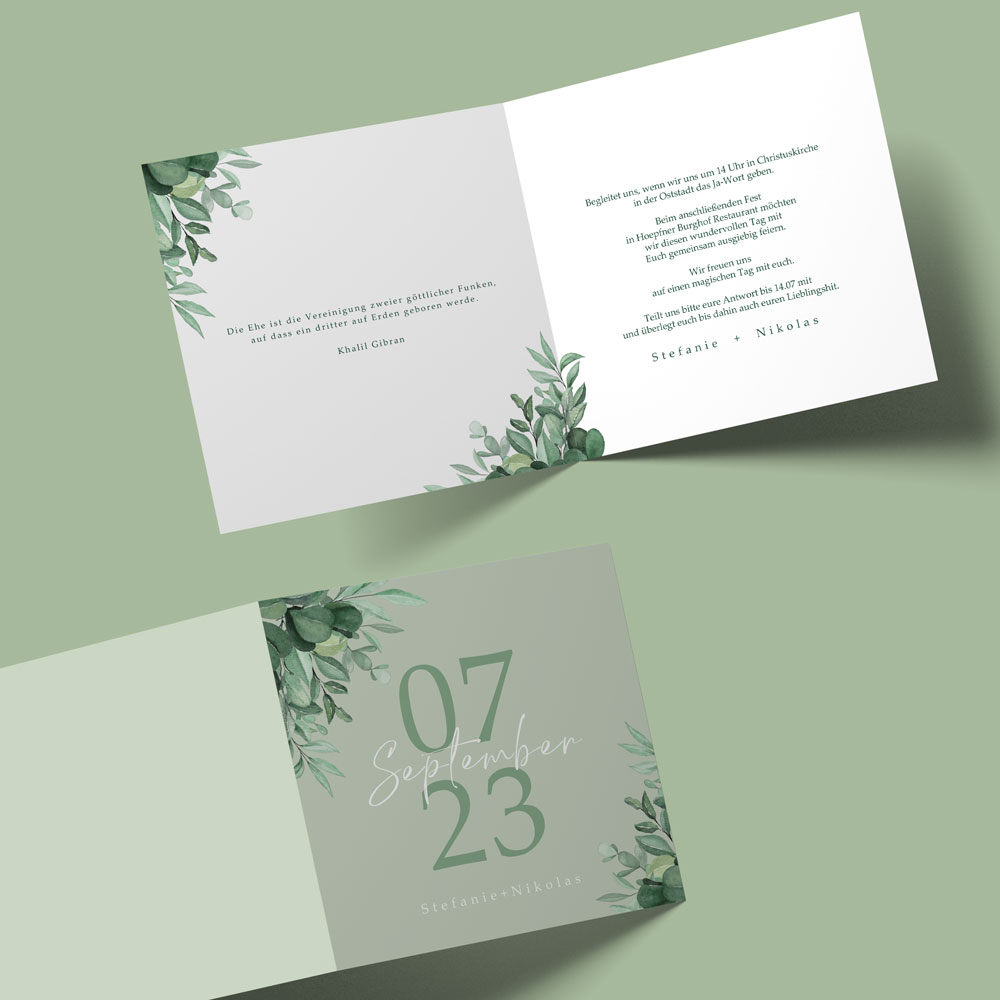Hergestellt auf seidenmattem Papier 300 gr/m2, mit äußerster Sorgfalt und Liebe zum Detail. Die Hochzeitseinladungen haben eine quadratische Form, die sich wie eine Karte öffnen lässt, sind maschinell geschnitten und gefaltet.